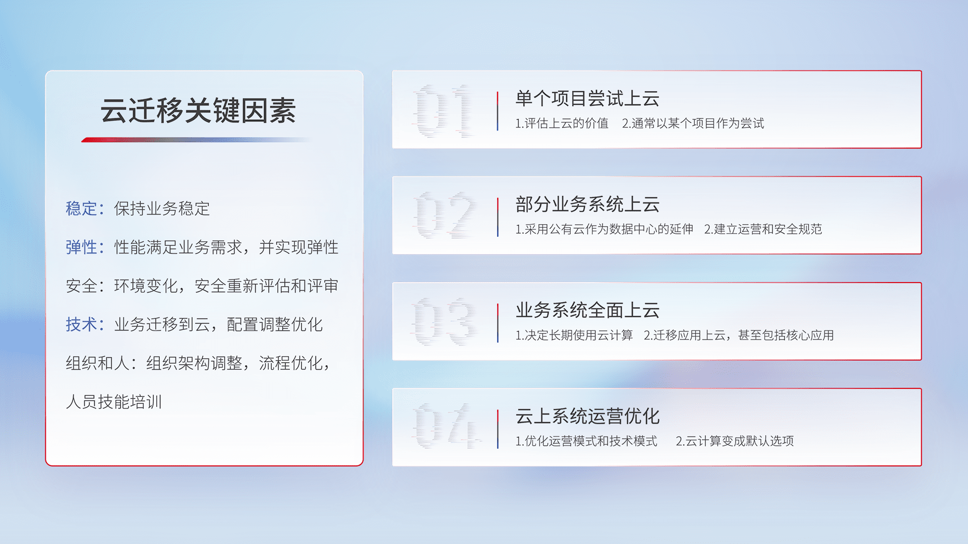 结合实际业务,,,,从规划设计、、、、云平台选型、、云原生改造、、数据迁移、、集成交付,,迁移全过程为客户识别最佳上云路径,,,做好风险识别管理,,,,设计网络架构、、、、身份权限、、、、安全审计合规、、、、操作审计、、日志审计、、监控告警策略、、、多站点容灾设计等,,,,对云上基础设施进行整体规划,,,,提升IT治理水平,,以满足弹性、、高可用、、、、高性能的需求。。。。